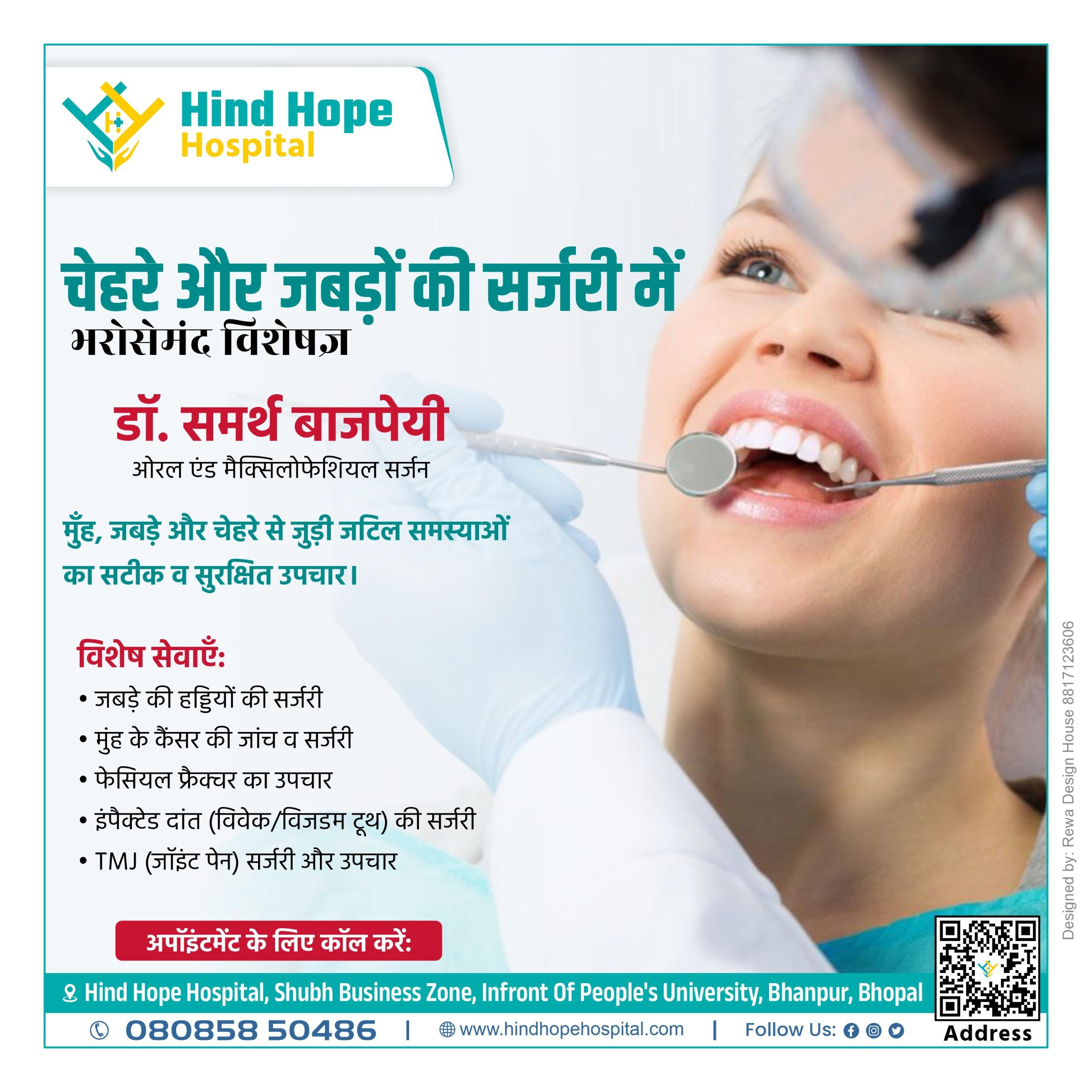 When it comes to complex problems of the face, mouth, and jaw, it is essential to seek specialized care from a qualified expert. These areas are not just critical for appearance but also vital for basic functions like eating, speaking, and breathing. At Hind Hope Hospital, Bhopal, patients can now benefit from world-class oral and maxillofacial surgery services, provided by the highly skilled and trusted Dr. Samarth Bajpai.